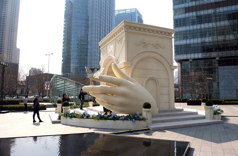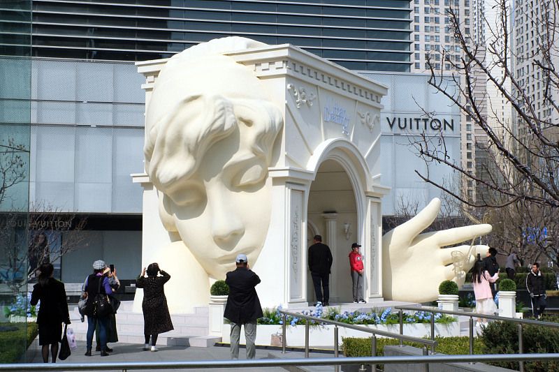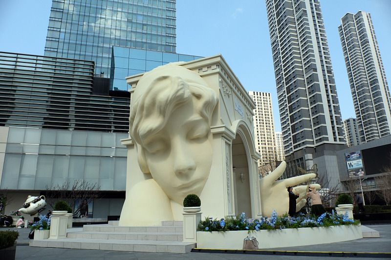 2024年4月11日,辽宁沈阳,一组超现实奇境花园艺术装置亮相青年大街与文艺路十字路口,吸引过往市民拍照打卡。
