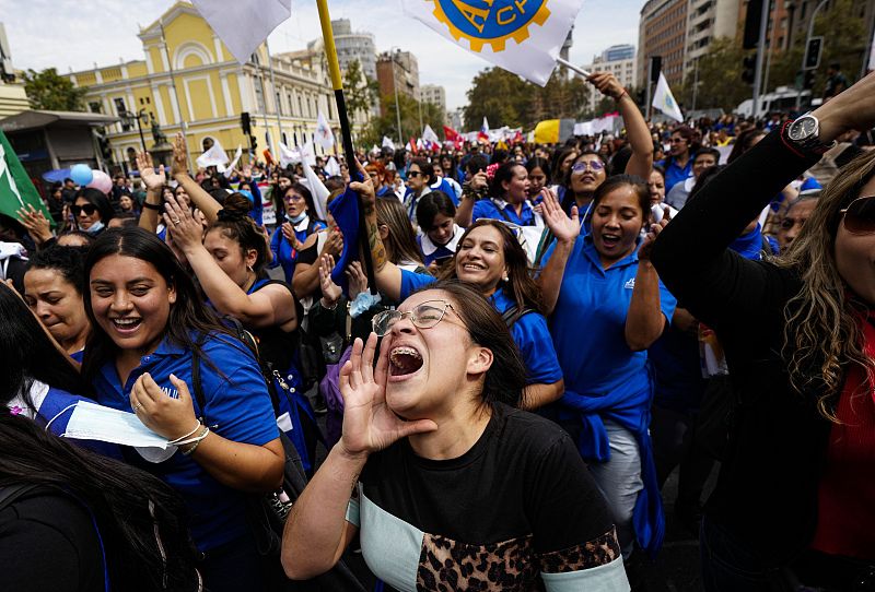 当地时间2024年4月11日,智利圣地亚哥,智利中央单位工人工会召集罢工期间,人们参加游行。这次罢工是为了抗议智利总统加夫列尔·博里奇的政府、大企业利益集团和保守政党。