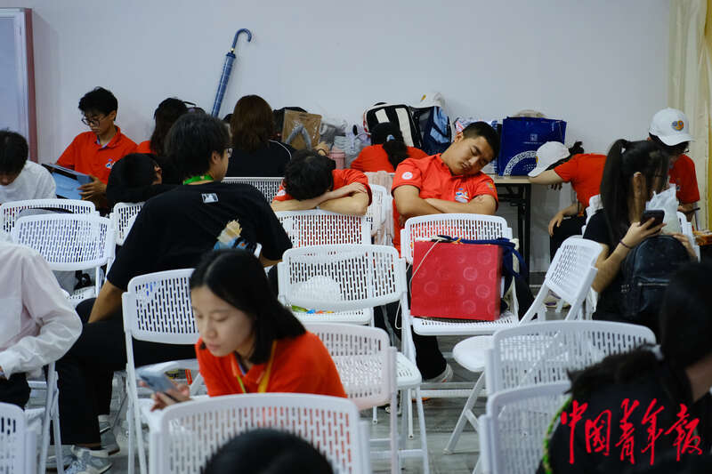 4月17日,海南海口,海南国际会展中心,第四届中国国际消费品博览会首个公众开放日,在场馆内的志愿者休息区,志愿者们在休息。他们在工作中实施倒班制度,平均一班的工作时长在一个半小时左右。田嘉硕/摄