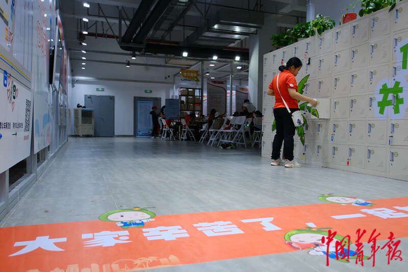4月17日,海南海口,海南国际会展中心,第四届中国国际消费品博览会首个公众开放日,在场馆内的志愿者休息区,一名志愿者正在存放自己的物品。田嘉硕/摄