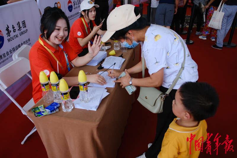 4月17日,海南海口,海南国际会展中心,第四届中国国际消费品博览会首个公众开放日,在场馆安检入口,一名志愿者与进行入场登记的小观众打招呼。田嘉硕/摄