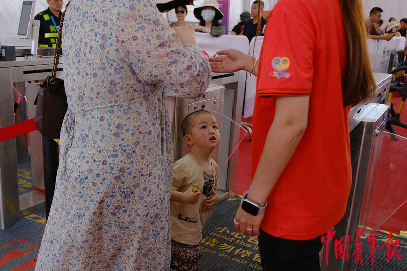 4月17日,海南海口,海南国际会展中心,第四届中国国际消费品博览会首个公众开放日,在场馆安检入口,一名小观众抬头望向正在提供服务的志愿者。田嘉硕/摄