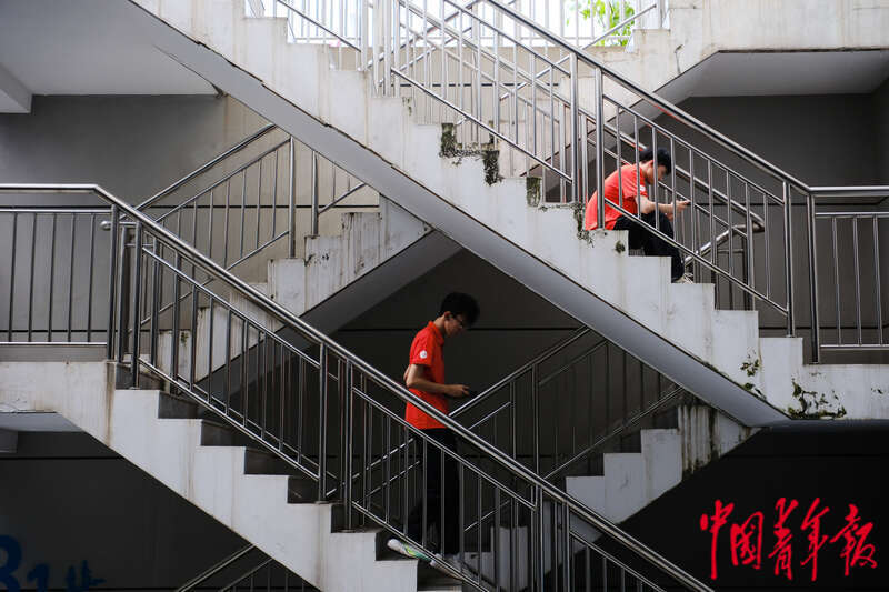 4月17日,海南海口,海南国际会展中心,第四届中国国际消费品博览会首个公众开放日,在场馆内的志愿者休息区,两名志愿者在楼梯上休息。田嘉硕/摄