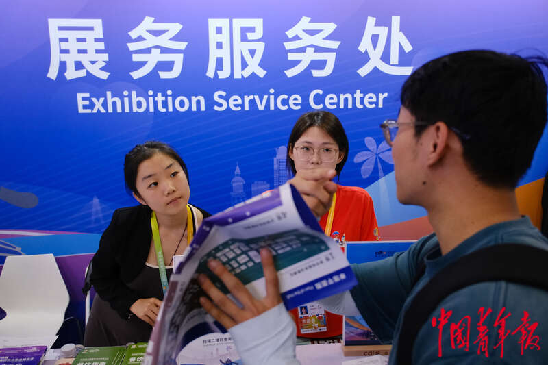 4月17日,海南海口,海南国际会展中心,第四届中国国际消费品博览会首个公众开放日,在场馆内的展务服务处,两名“小椰青”(消博会青年志愿者的昵称,编者注)为游客提供咨询引导服务。据介绍,本届消博会共有来自海南7所高校的1210名大学生志愿者参与志愿服务,保障展会顺利进行。田嘉硕/摄