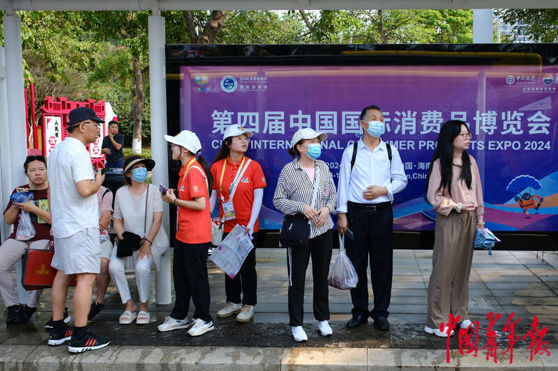 4月17日,海南海口,海南国际会展中心,第四届中国国际消费品博览会首个公众开放日,在场馆对面的公交站台,两名志愿者为离场观众提供引导咨询。他们手中拿着的是消博会1号至12号专线的线路图。田嘉硕/摄