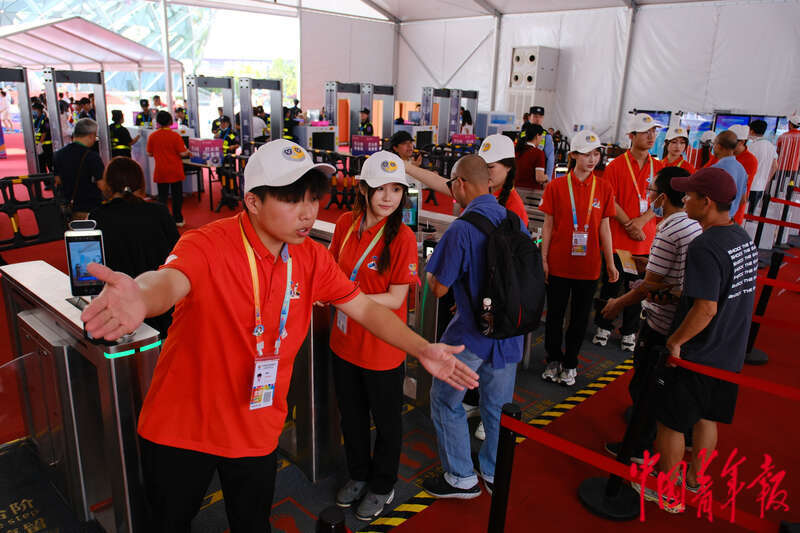 4月17日,海南海口,海南国际会展中心,第四届中国国际消费品博览会首个公众开放日,在场馆安检入口,志愿者们在闸机前为等待入场的观众提供引导。据介绍,“小椰青”们每天早上8点到达服务点位,下午6点结束,一些志愿者为营造良好形象,早上4点就起床化妆。田嘉硕/摄