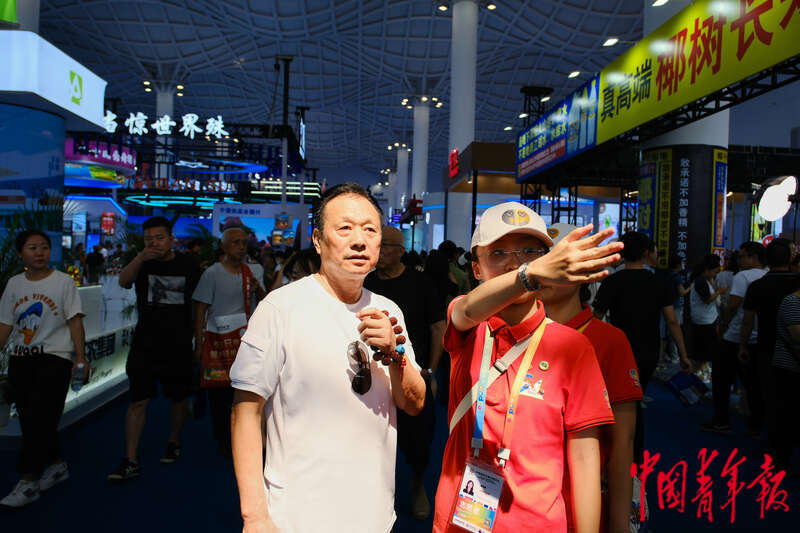 4月17日,海南海口,海南国际会展中心,第四届中国国际消费品博览会首个公众开放日,在场馆内,一名志愿者为观众指路。田嘉硕/摄