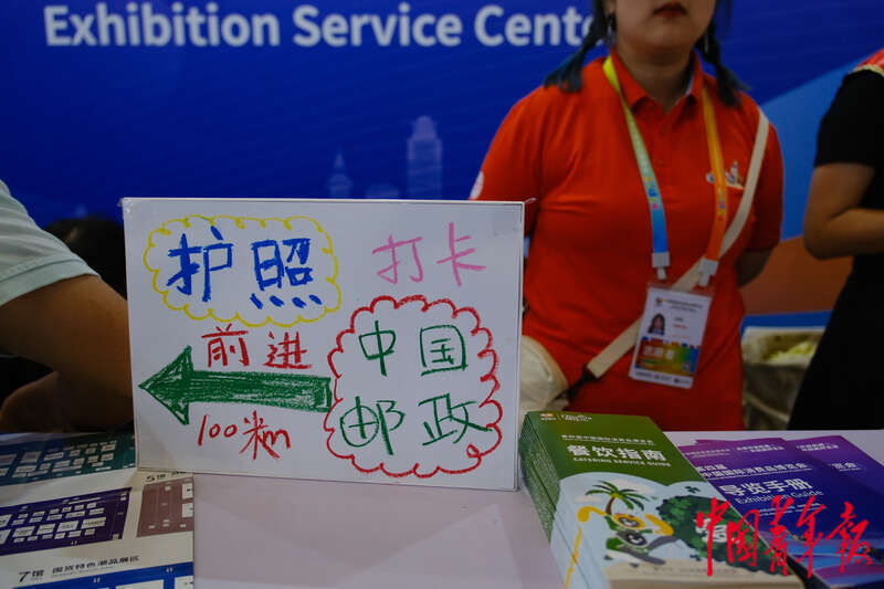 4月17日,海南海口,海南国际会展中心,第四届中国国际消费品博览会首个公众开放日,在场馆内的展务服务处,志愿者们为观众贴心制作了手绘引导牌。田嘉硕/摄