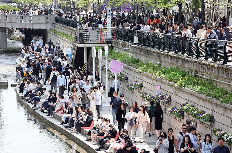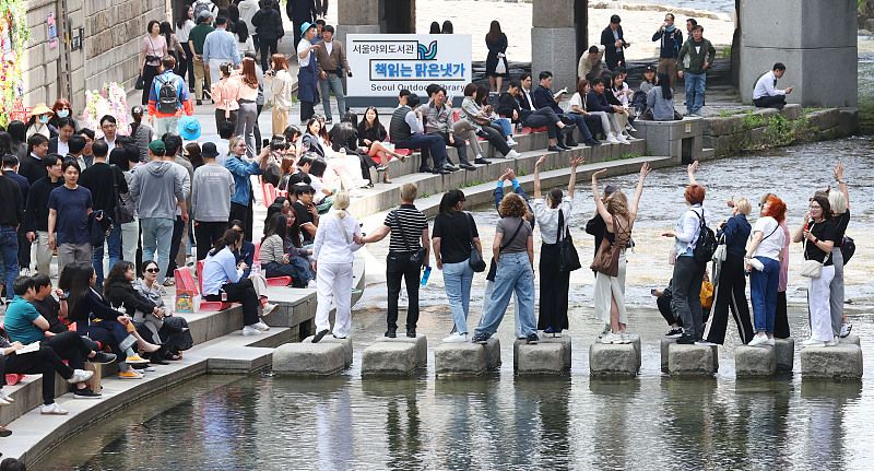 当地时间2024年4月18日,韩国首尔,在清溪川开放的首尔户外图书馆——“清溪川读书的清澈溪边”,市民们坐在椅子上看书休息。当日白天最高气温达到18-27度。
