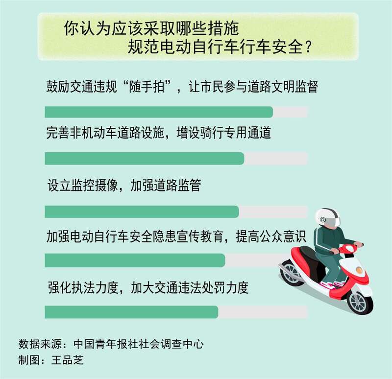 近日,中国青年报社社会调查中心联合问卷网(wenjuan.com),对2002名受访青年进行的一项调查显示,90.8%的受访者遇到过电动车不文明骑行的行为。规范此类行为,66.8%的受访者建议鼓励交通违规“随手拍”,让市民参与道路文明监督,62.4%的受访者建议完善非机动车道路设施,增设骑行专用通道。