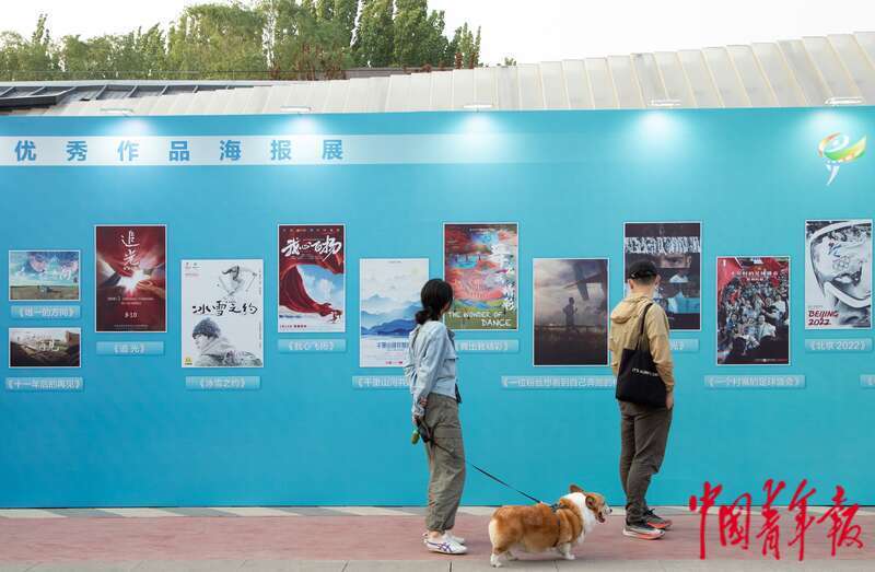 4月21日,北京郎园Station园区内,两位参观者带着宠物参观第20届北京国际体育电影周优秀作品海报展。杨郁然/摄