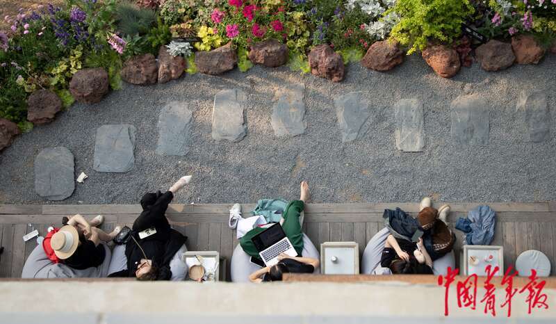 4月21日,北京郎园Station园区内,几位参观者在咖啡厅工作、休息。杨郁然/摄