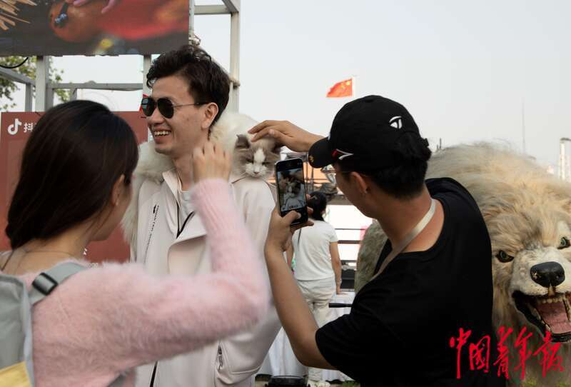 4月21日,北京郎园Station园区内,一位参观者肩上的宠物猫正在被围观。本次活动设置在宠物友好园区内,现场有不少参观者带着自家“毛孩子”观展游玩。杨郁然/摄