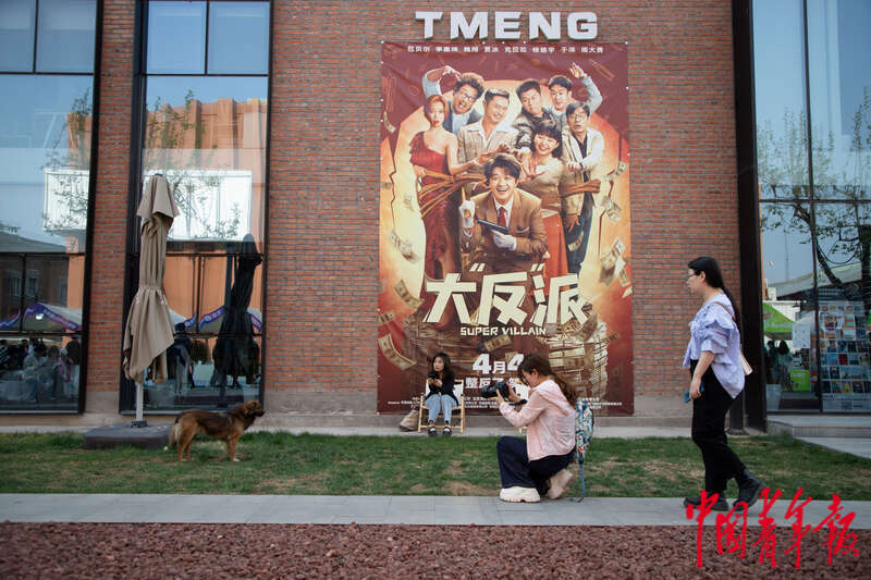 4月21日,北京郎园Station园区内,一位参观者坐在巨幅电影海报前休息,另一位参观者正在为宠物狗拍照。杨郁然/摄