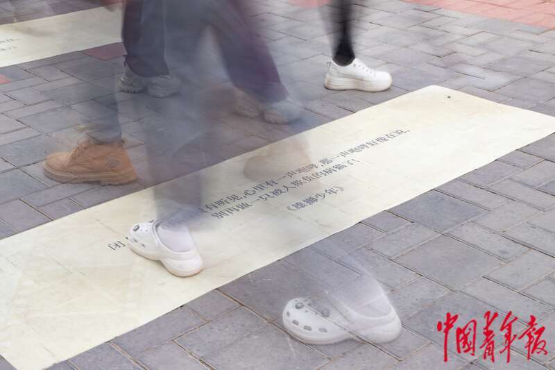 4月21日,北京郎园Station园区内,来往的参观者走过文创展区贴有《雄狮少年》等电影经典台词的路。杨郁然/摄