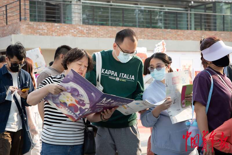 4月21日,北京郎园Station园区内,影游展区“电影频道·六公主有礼”摊位前,排队集章的参观者正在看自己收集在园区地图册上的印章。杨郁然/摄