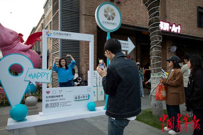 4月21日,北京郎园Station园区内,参观者在北京国际电影节打卡处拍照。