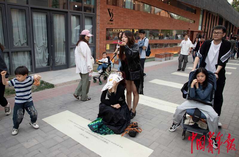 4月21日,北京郎园Station园区内,来往的参观者走过文创展区内一段贴有电影台词的路,一位参观者手拿活动图册,和电影《爱乐之城》台词合照。这段路长数十米,包含中外多部经典电影台词,吸引了众多参观者驻足留念。杨郁然/摄