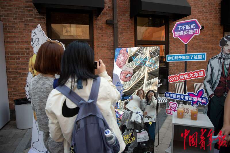 4月21日,北京郎园Station园区内,两位参观者在星迷宇宙特展区对镜拍照。这是本次活动九大特展之一,设置了多个打卡点位供参观者留念。杨郁然/摄