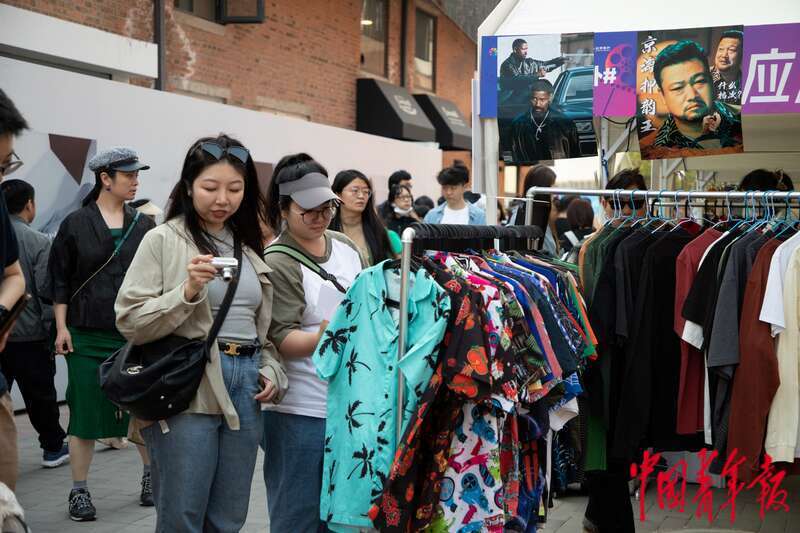 4月21日,北京郎园Station园区内,两位参观者正在文创展区摊位处挑选特色服饰,展位上装饰着电影剧照。杨郁然/摄