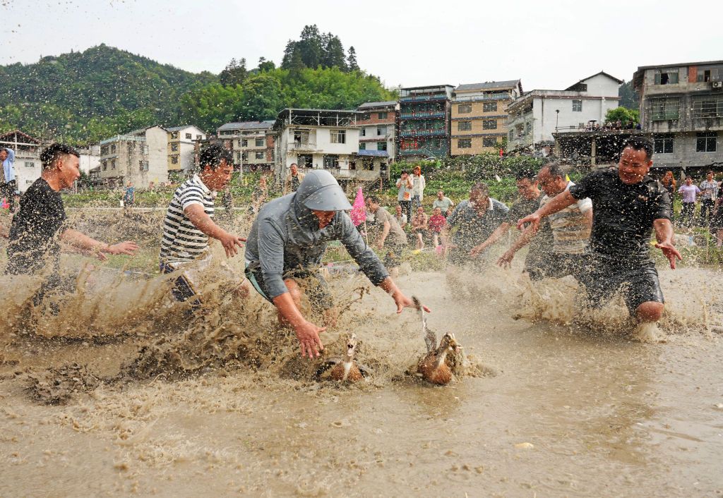 2024年5月15日,农历四月初八,广西柳州,融水苗族自治县怀宝镇盘荣村举行闹田活动,村民在储水待插的水田里拔河、抢活鸭和锄田等,意在闹醒土地,迎接插秧时节到来,并祈盼新的一年风调雨顺、五谷丰登。