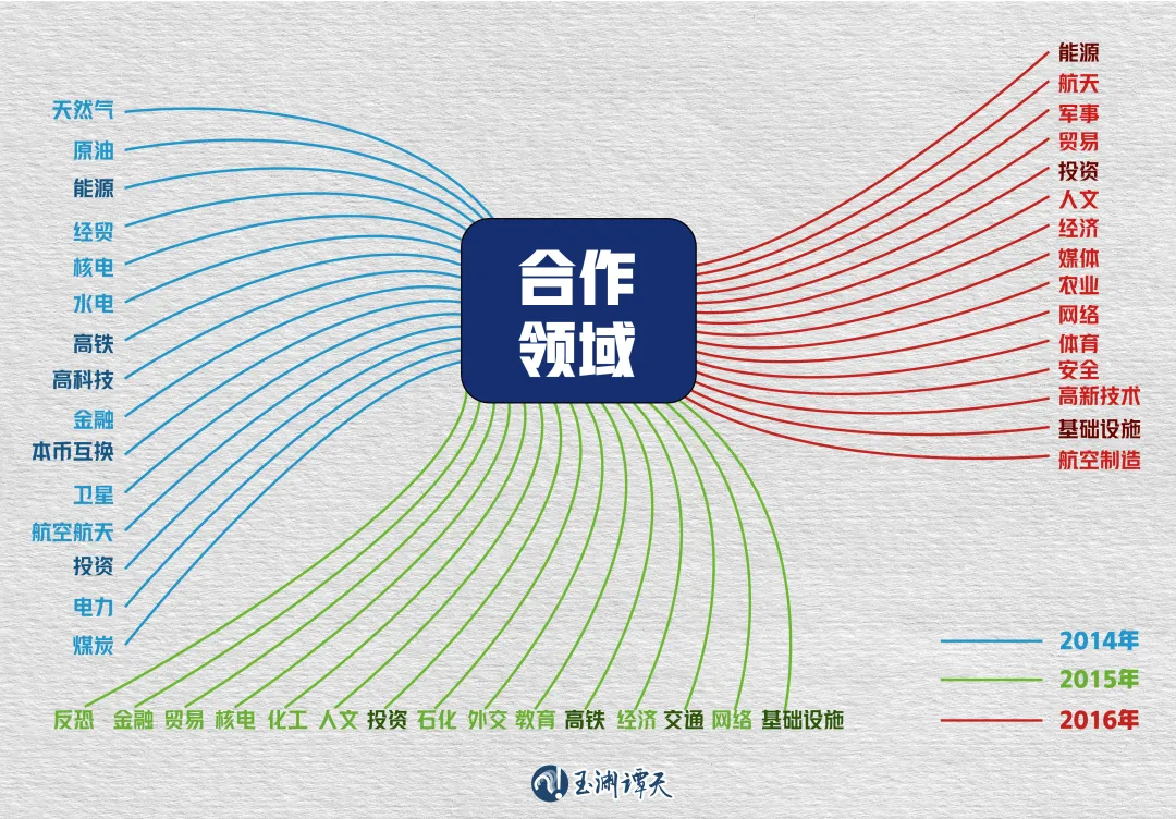 谭主搜集了2013年以来,习近平主席同普京总统交流的新闻稿,并对其中与“合作”共现的词语进行了全量分析。谭主发现,特别是从2014年开始,“一带一路”“能源”“高铁”“基础设施”“投资”“高科技”和“本币互换”等词,开始频繁出现。