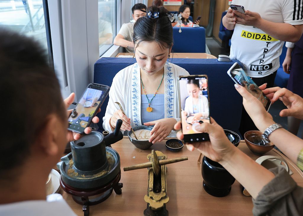 2024年5月20日,在G2807次列车上,高铁乘务员展示点茶技艺。在“国际茶日”到来之际,铁路南京客运段在G2807次高铁列车车厢内举办茶文化主题活动,高铁乘务员通过茶叶知识介绍、茶艺表演和品茶等活动,丰富旅客旅途生活,展示弘扬茶文化。