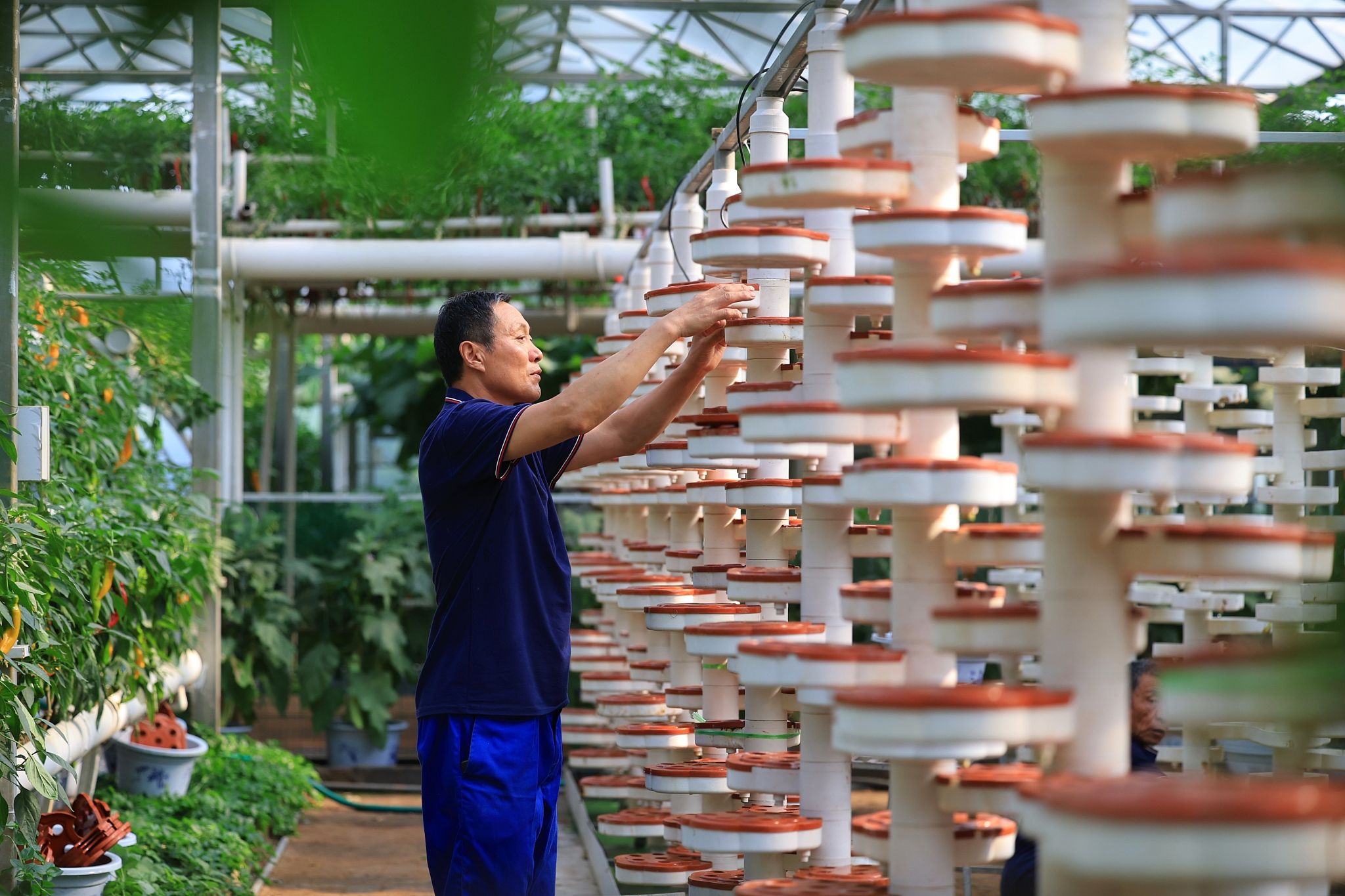 2024年5月22日,山东潍坊,寿光菜博会举办,菜博会上工作人员对立体培育进行前期准备。