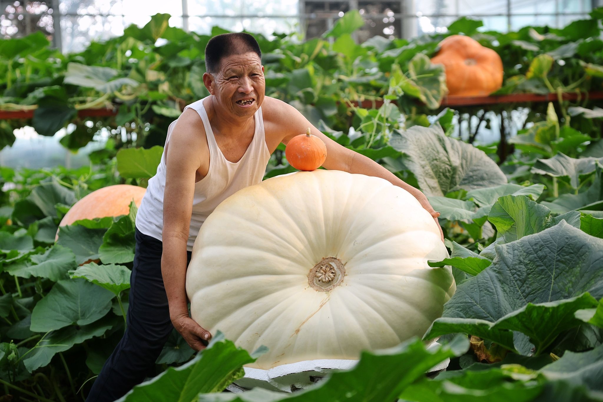 2024年5月22日,山东潍坊,寿光菜博会举办,菜博会上数百斤的大南瓜。