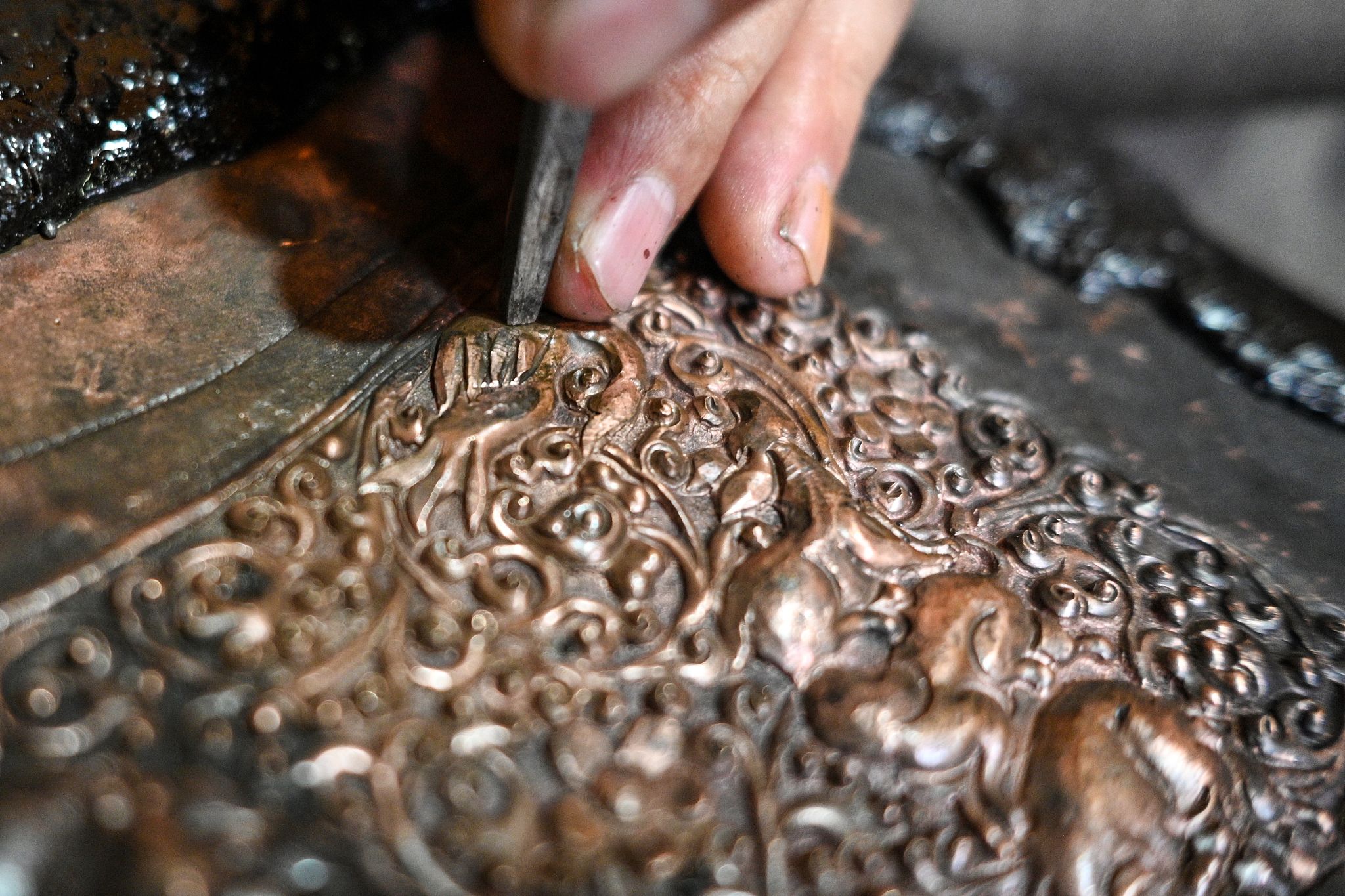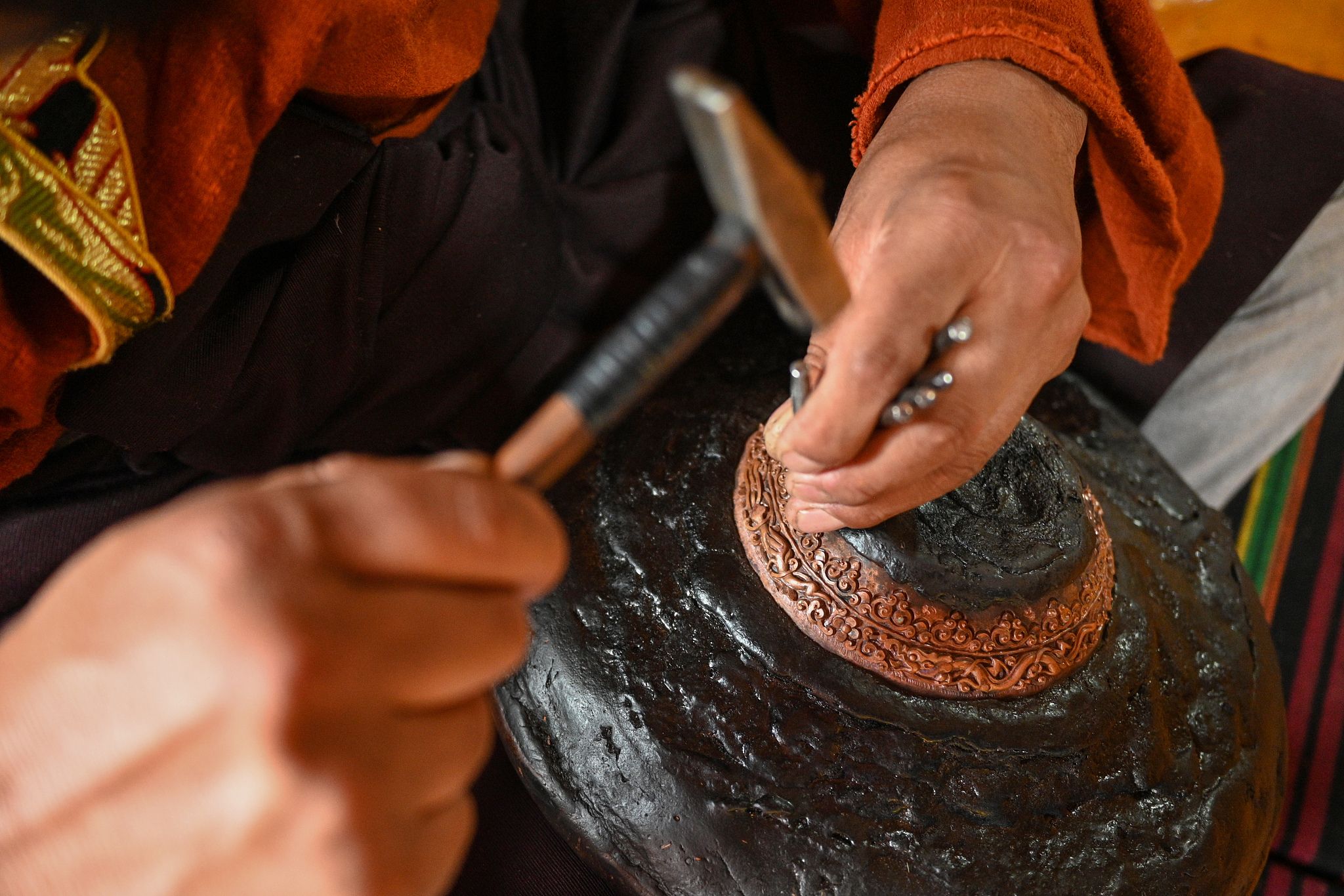2024年5月30日,四川甘孜州,一名手工艺人在制作自己的作品。四川省甘孜藏族自治州白玉县河坡镇金属锻造技艺历史悠久。当地成立手工艺传习基地,吸引众多藏族青年学习传统技艺。
