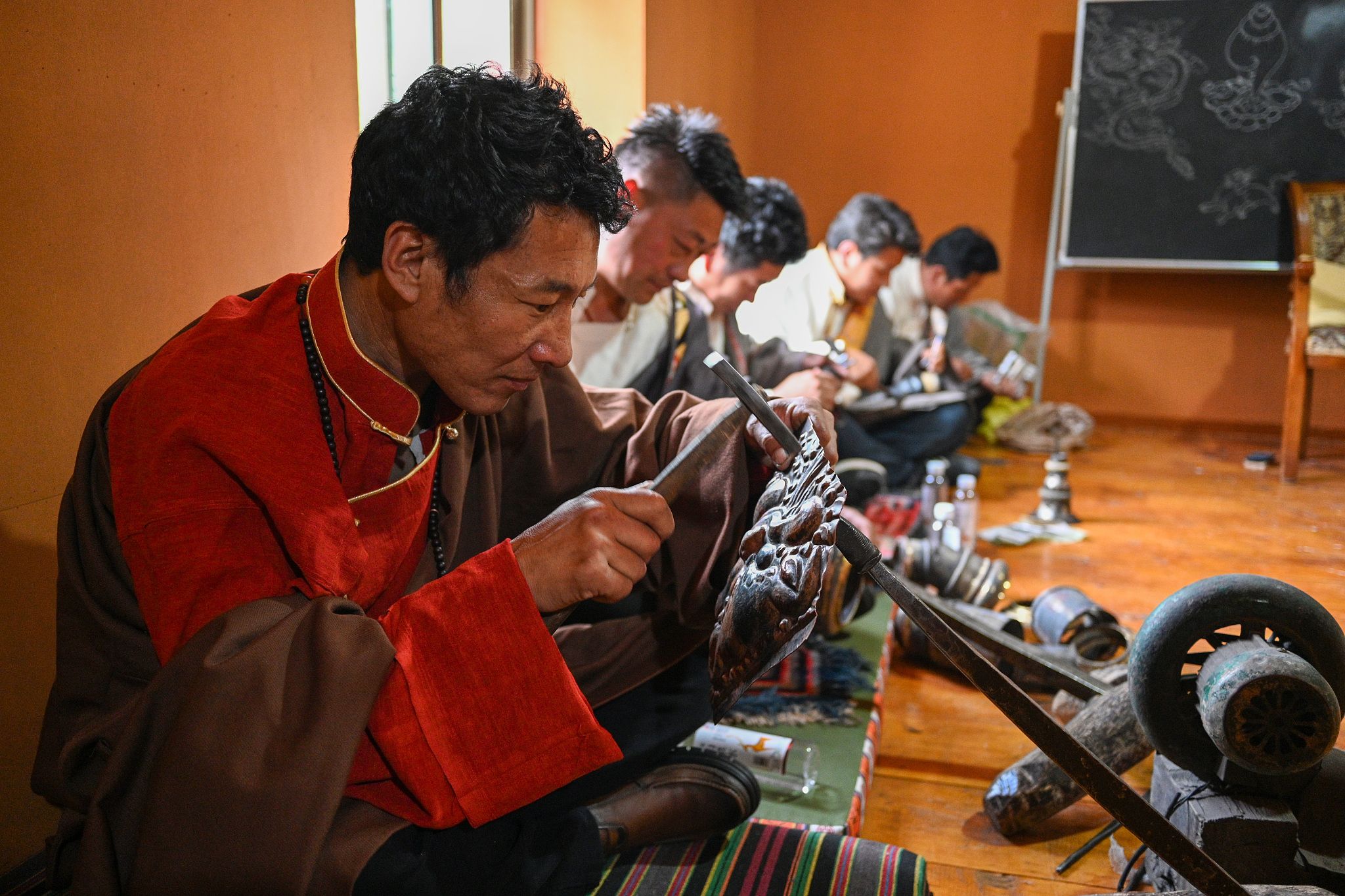 2024年5月30日,四川甘孜州,白玉河坡手工艺传习基地手工艺人们在工作。四川省甘孜藏族自治州白玉县河坡镇金属锻造技艺历史悠久。当地成立手工艺传习基地,吸引众多藏族青年学习传统技艺。