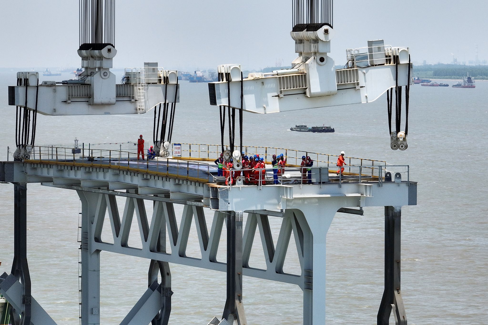 2024年5月29日,江苏常州,架桥机将常泰长江大桥最后一节钢梁缓缓吊起。