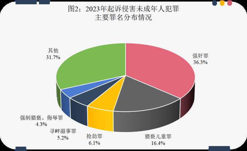 《白皮书》还显示,2023年,全国检察机关起诉侵害未成年人犯罪人数较多的罪名包括:强奸罪24332人、猥亵儿童罪11013人、抢劫罪4103人、寻衅滋事罪3529人、强制猥亵、侮辱罪2887人,五类犯罪人数合计占起诉侵害未成年人犯罪总数的68.3%。