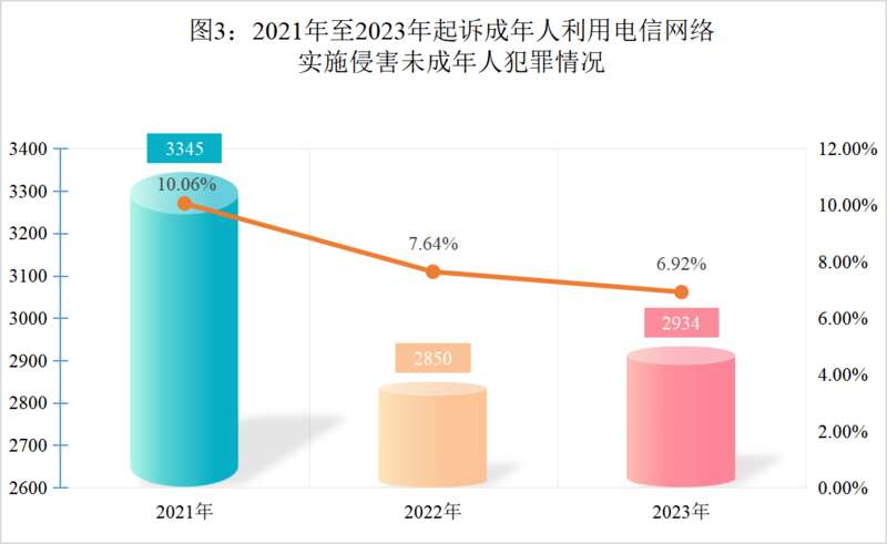 中青报·中青网记者注意到,办理成年人利用电信网络侵害未成年人犯罪案件占比下降。2023年,全国检察机关起诉成年人利用电信网络实施侵害未成年人犯罪2934人,在成年人侵害未成年人犯罪中的占比从2022年的7.64%下降至2023年的6.92%。