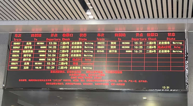6月21日桂林站,一楼候车信息大屏显示部分车次有晚点、停运的情况。吴欣宇/摄