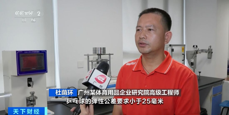 广州某体育用品企业研究院高级工程师 杜荫环:根据国际乒联的标准,乒乓球的弹性公差要求小于25毫米,而我们品牌的巴黎奥运会比赛用球弹性公差小于4毫米。