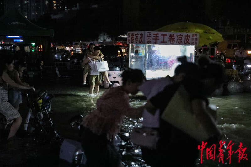 7月22日晚,河南郑州,行人互相搀扶着、背着走在积水的道路上。当日,受强对流天气影响,郑州突降暴雨,短时强降水造成郑州城区多处积水。郑州市气象台升级发布暴雨橙色预警信号,提请注意防范强降雨引发的城市内涝、中小河流洪水等次生灾害。中青报·中青网记者 孔斯琪/摄