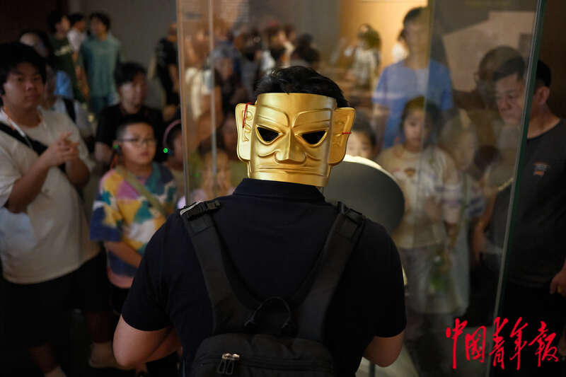 7月24日,北京市通州区,北京大运河博物馆,一名少年研学团的导游正在向同学们讲解三星堆的文物故事,他的脑后戴着一副三星堆金铜人头像面具周边。据悉,“探秘古蜀文明——三星堆与金沙”展,自6月27日开展以来,吸引众多市民游客前来参观。该展览所展出的以三星堆和金沙遗址为代表的古蜀文明珍品,首次在北京大规模亮相。田嘉硕/摄