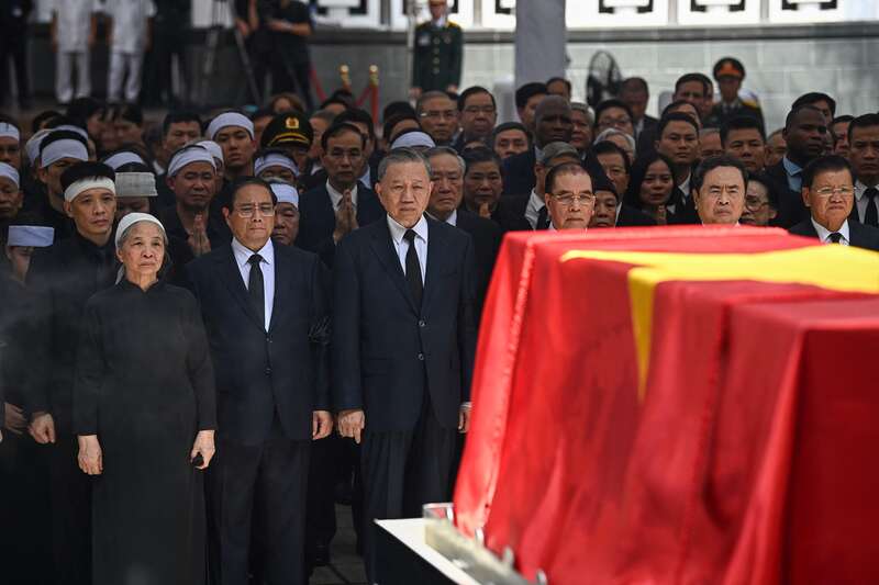 7月26日,越南河内,(前排左至右)已故越南共产党总书记阮富仲的夫人、越南总理范明政和越南国家主席苏林站在阮富仲的灵柩前。越共中央委员会以及越南国会、国家主席、政府、祖国阵线中央委员会7月20日发布特别公告说,已故越共中央总书记阮富仲的国葬于当地时间7月25日和7月26日举行。视觉中国供图