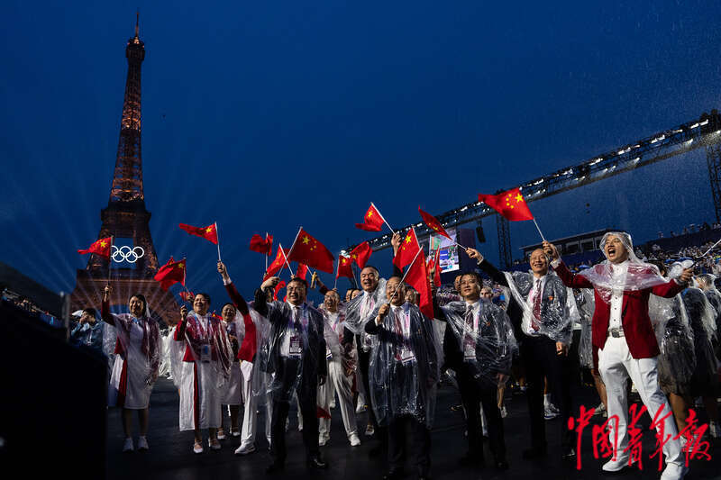 当地时间7月26日晚,法国巴黎,2024年巴黎奥运会开幕式现场,中国体育代表团亮相特罗卡德罗广场。本届奥运会,中国体育代表团派出由42位奥运冠军领衔的队伍,将参加30个大项42个分项236个小项的比赛。这是现代奥运会历史上首次在开放式城市空间举行开幕式。205个代表团约6800名运动员搭乘85艘船只,从奥斯特里茨桥出发,向西航行约6公里,途经巴黎圣母院、卢浮宫、协和广场等标志性建筑,至埃菲尔铁塔对岸的特罗卡德罗广场参加庆祝仪式。中青报·中青网记者 李隽辉/摄
