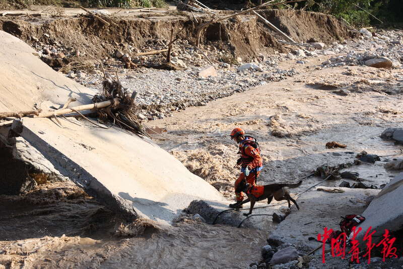 7月22日下午,来自四川省凉山州森林消防支队的消防救援人员携带搜救犬,在四川省雅安市汉源县马烈乡沿河道搜寻失联人员。连日来,消防、公安等救援力量利用生命探测仪、搜救犬、无人机等对村民住宅区域、沿河下游段开展搜救。截至22日14时30分,已搜寻到14具遇难者遗体,仍有25人失联。中青报·中青网记者 王鑫昕/摄