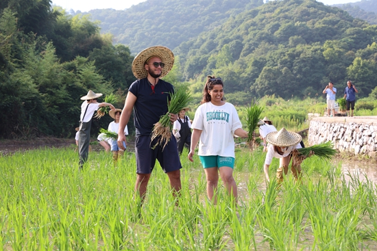 夏意正隆,适逢南方稻田“双抢”时节。宁波大学20名留学生戴上斗笠,挽起裤脚组成“插秧小分队”,来到宁波市奉化区裘村镇助力当地农户“双抢”农忙。来自摩洛哥的塞尔玛之前只是听说过如何种植水稻,现在自己动手种植,她表示“这种感觉很奇妙”,也让她看见了一个“既美丽又生动的中国”。