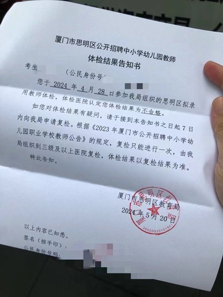 她找到思明区教育局,对方回应是参照《福建省教师资格申请人员体检标准》“依规办事”。但在此前,她通过了同样是依据此标准考核的福建省教师资格考试,并且由思明区教育局颁发了教师资格证书。“所以怎么会一个标准出现两种结果?”李玉不解。