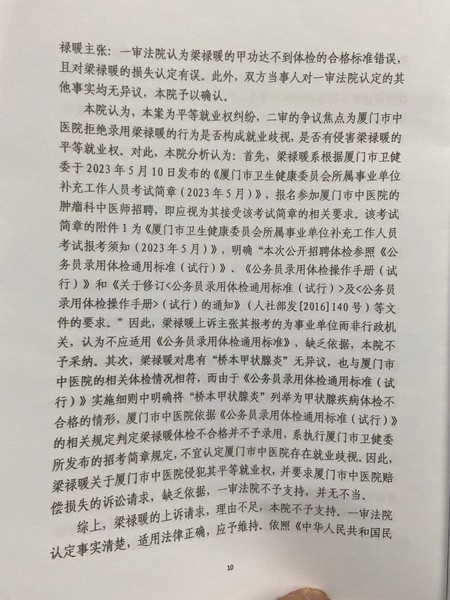 2023年6月,梁禄暖以笔试和面试第一的成绩通过厦门市中医院“肿瘤科中医师”岗位的考核,但因“甲功达不到体检合格标准”被判体检不合格,无法入职。