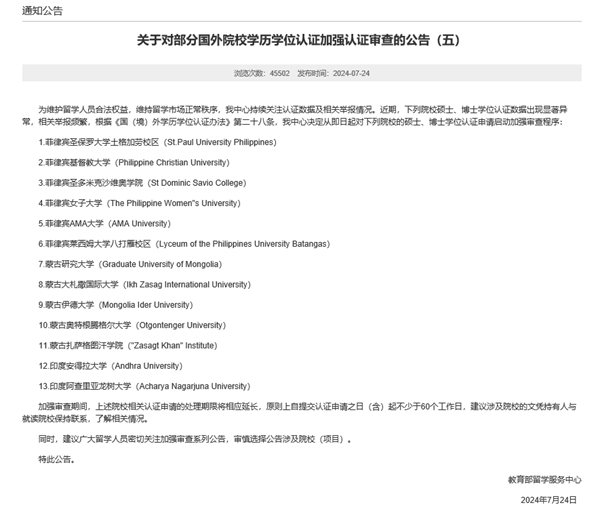 《关于对部分国外院校学历学位认证加强认证审查的公告(五)》中写道,教育部留学服务中心持续关注认证数据及相关举报情况,从7月24日起,对包括蒙古国5所院校在内的共计13所院校,申请启动加强审查程序。“加强审查期间,上述院校相关认证申请的处理期限将相应延长,原则上自提交认证申请之日(含)起不少于60个工作日,建议涉及院校的文凭持有人与就读院校保持联系,了解相关情况。”