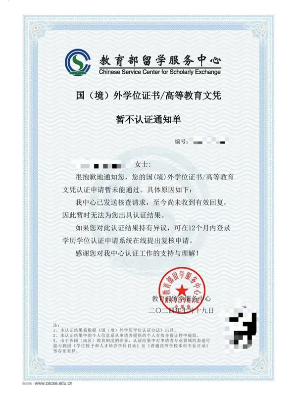 蒙古国某私立大学授予的相关学位,我国教育部留学服务中心回复《暂不认证通知单》。受访者供图