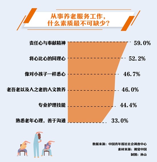 中国青年报社社会调查中心联合问卷网(wenjuan.com)于今年4月对1001名青年进行的调查显示,77.8%的受访青年看好养老服务行业的发展前景,71.9%的受访青年看好年轻人投身养老服务业。