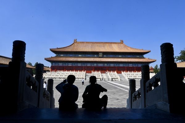 2024年8月29日,北京,太庙古建区,不少游客赶在开学前,带孩子前来打卡,在享殿前拍照合影。