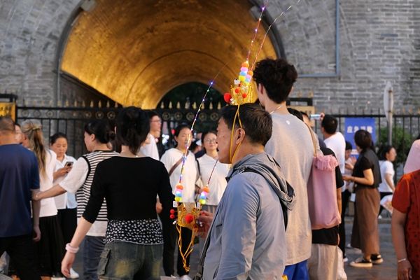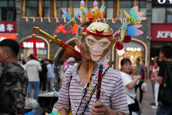 2024年8月29日,陕西西安,钟鼓楼景区和回民街游人如织,不少游客购买美猴王花翎、面具等饰品游览景区。