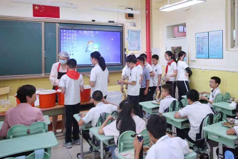 9月2日中午12:00,记者在白家庄小学五年级九班看到,送餐人员推着餐车、餐桶,带着新的餐具来到了班门口,班主任也做好了为学生分餐的准备。